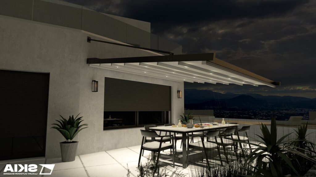 Τα συστήματα πέργκολας της εταιρίας μας μπορούν να συνδυαστούν με φωτισμό LED, πλήρως παραμετροποιήσιμο ανάλογα με τις ανάγκες φωτισμού του εκάστοτε χώρου.